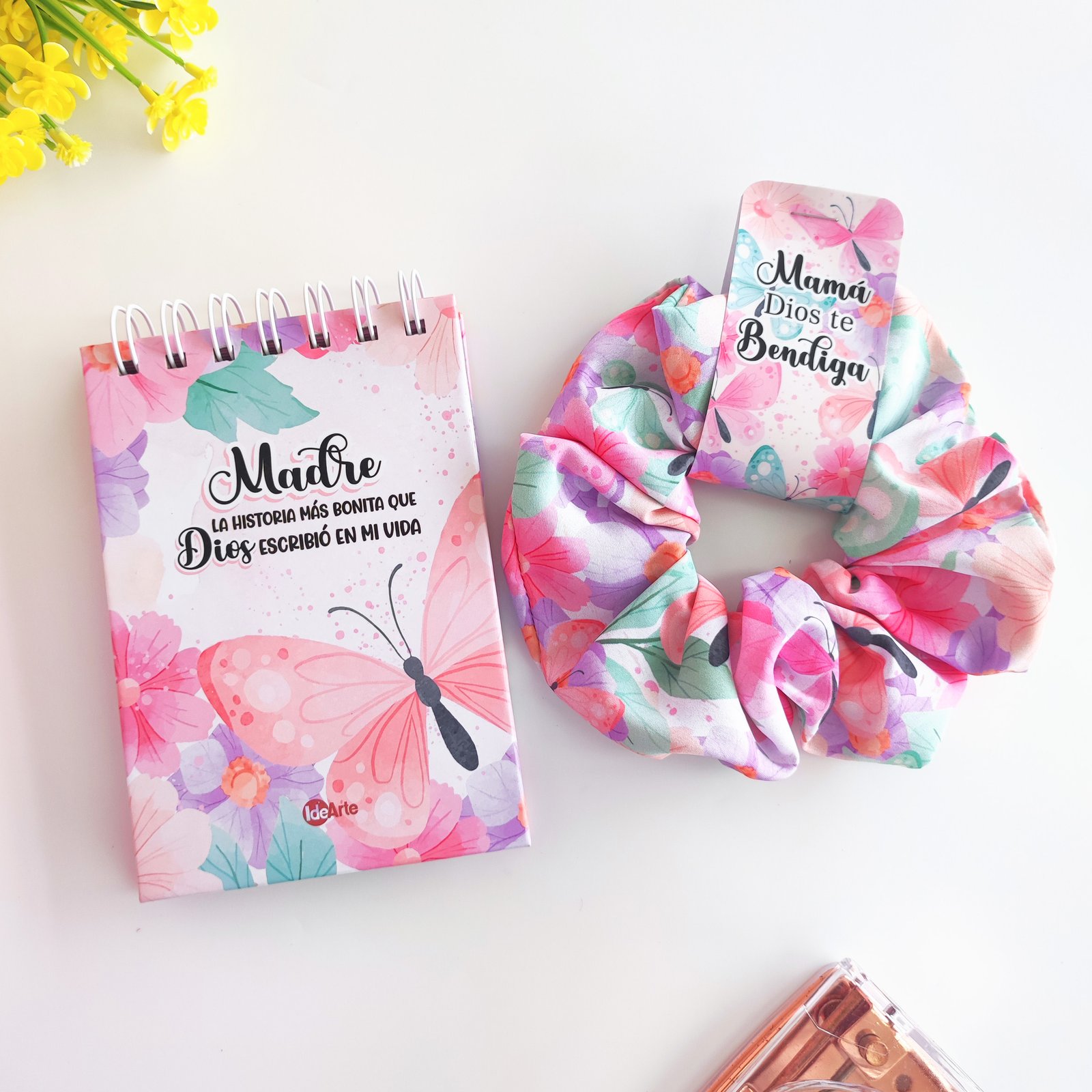 Hemos unido dos, de los favoritos para crear el combo ideal, pequeños detalles, grandes emociones. Mini libreta par tus tareras diarios y una linda bamba que mantienen el pelo cómodo y protegido.